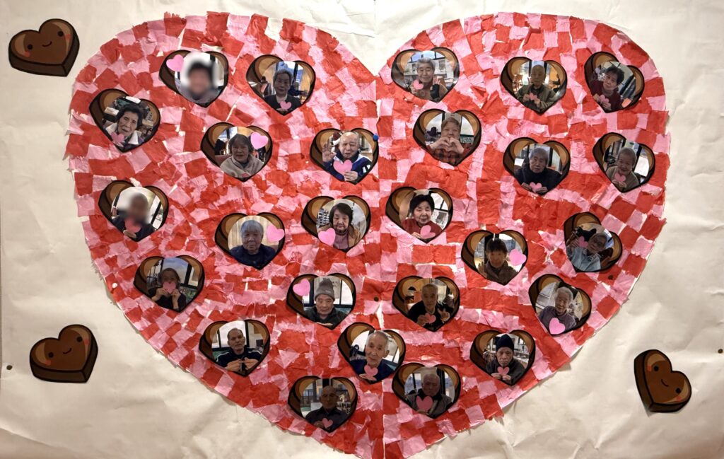色紙をハートの形にペタペタ貼り付け利用者様の写真を貼って可愛いバレンタイン壁画を作りました😊